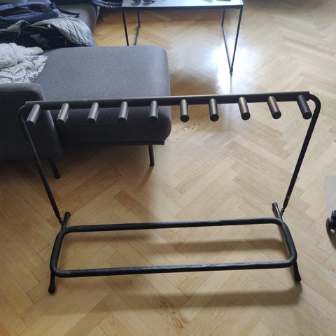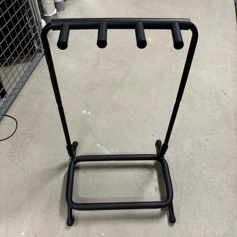 Gitarrställ i svart metall för förvaring av gitarr. Stället har två nedre stöd med skyddande överdrag för att hålla instrumentet på plats och minska risken för repor. Passar akustiska eller elektriska gitarrer beroende på kroppsstorlek och form. Lämpligt för användning i hemmet, replokalen eller studion.