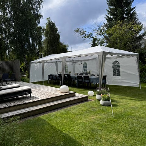 Toolport partytält i vitt med fönstersektioner på långsidorna. Tältet har stomme i metall och väggar samt tak i textilmaterial. Det är utformat för användning vid till exempel trädgårdsfester och andra utomhusevenemang, med plats för bord och stolar under tak. Väggarna kan öppnas eller stängas för att anpassa tältet efter väder och behov.