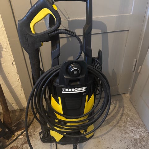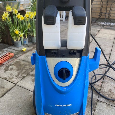 Hamron högtryckstvätt i grön/svart färg. Utrustad med slangvinda och elsladdshållare upptill. Maskinen har hjul och handtag för enklare förflyttning. Lämplig för rengöring av exempelvis uteplats, fordon och trädgårdsutrustning. Bullernivå märkt till 92 dB enligt skylt på baksidan. Drivs med el och ansluts till vatten via standardkoppling.