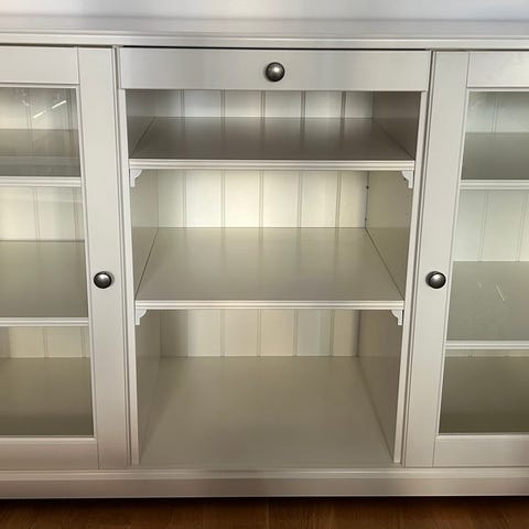 En skänk / sideboard från ikea, svart med glasdörrar, lådor, och hyllor.