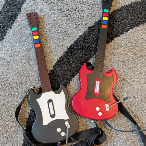 Playstation 2 Guitar Hero spelpaket med två spel, två gitarrkontroller och två vanliga handkontroller. Spelen som ingår är Guitar Hero III: Legends of Rock och Guitar Hero: Aerosmith för Playstation 2. Paketet innehåller två röda gitarrkontroller med axelremmar samt två svarta handkontroller med kabel. Utrustningen är avsedd för användning med Playstation 2-konsol och passar för musik- och rytmspel där gitarrkontrollerna används som spelkontroller.