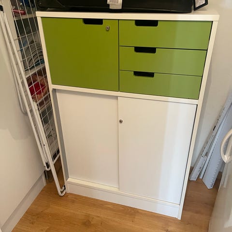 Skåpet har flera fällbara fack med god förvaring (se bilder). Smidig konstruktion som rymmer mycket utan att ta upp onödigt med plats.