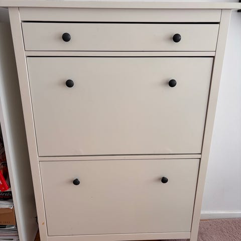 Säljer ett praktiskt och stilrent skoskåp i vitt med flera fack. Perfekt för hallen där man vill få undan skor och samtidigt hålla det snyggt.