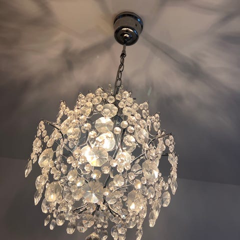 Taklampa med prismor 🌟 Vi har använt den som badrumslampa men den gör sig fin på flera ställen. Använd, men fortfarande i fint skick (dock kan prismorna behöva rengöras lite till). Glödlampor ingår inte.