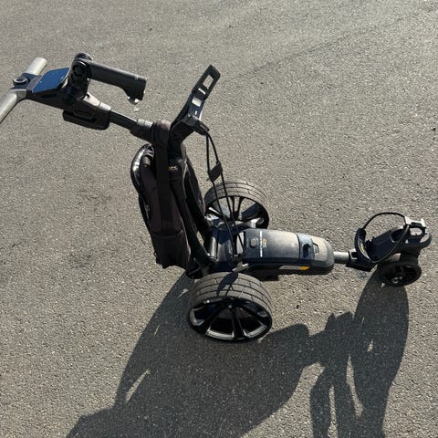 Motocaddy elektrisk golfvagn i svart och röd färg. Vagnen har tre hjul och är avsedd för transport av golfbag på golfbanan. Handtaget har integrerad kontrollpanel för styrning av den elektriska drivningen. På handtaget finns även hållare för scorekort eller surfplatta. Vagnen är hopfällbar för enklare förvaring och transport. Passar för användning på golfbana tillsammans med standardgolfbag.
