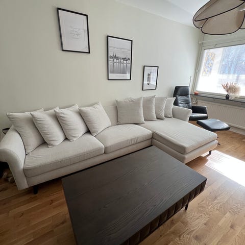 En stor soffa tillsalu. Får plats till 4-6 personer. Använd i två år.. Köpt från Mio. Soffan är i väldigt bra skick då inga barn hemma. Soffklädslar var kemtvättat två gånger om år pga lite OCD problem (hahaha).