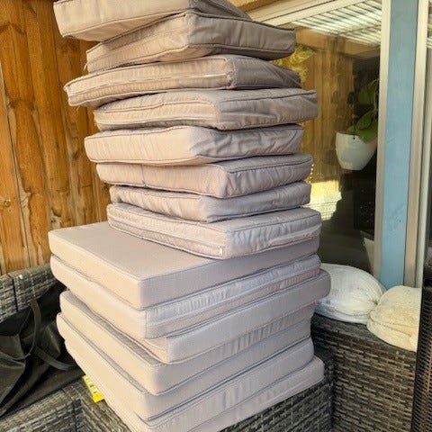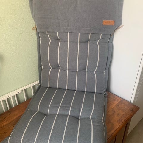 Fem rejäla vadderade dynor till soffgrupp i trädgården eller på altanen. Dynorna är sparsamt använda och har förvarats skyddade. 1.000kr för alla fem.