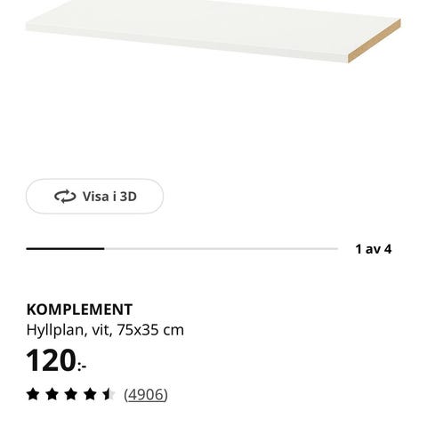 Ouppackat hyllplan från IKEA Komplement 75x58 cm vit. Två små skador på ovansidan innerst på hyllplanet och även paketet med fästen (kan inte lova att alla fästen finns med), se bilder.
