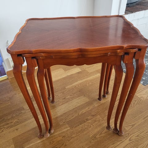 Satsbord i trä i tre storlekar. Borden har brun träyta med dekorativ ådring och profilerade ben. Passar som sidobord eller avlastningsbord i vardagsrum eller sovrum.