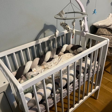 Stokke spjälsäng i brun nyans. Rund/oval modell med spjälor runtom och hjul för enkel förflyttning. Passar som sovplats för spädbarn och mindre barn i barnrum eller sovrum. Tillverkad i trä med madrassnivå som kan anpassas efter barnets ålder och behov, beroende på hur sängen monteras enligt tillverkarens anvisningar.