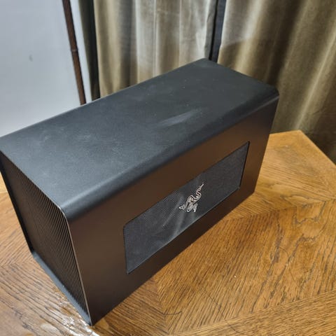 Razer Core X extern GPU-docka i svart utförande. Enheten är avsedd för användning som extern grafikkortslösning till dator via anslutning med kompatibel kabel (till exempel Thunderbolt, beroende på version). Chassit har ventilationsgaller på sidorna för luftflöde och är utformat för att rymma ett separat grafikkort (säljarens specifika konfiguration framgår inte). Lämplig som övrigt datortillbehör för stationär eller bärbar dator som behöver extern grafikprestanda.