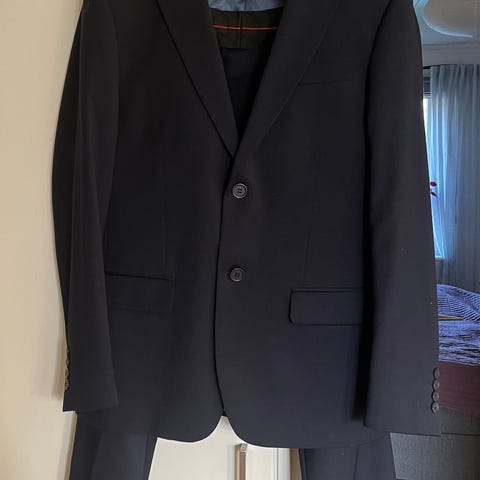 En mörkblå kavaj storlek 48 long slim fit med byxor i storlek W33L34 slim fit. Hela kostymen 500 kronor.