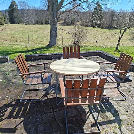Bord med fyra stolar samt dynor.