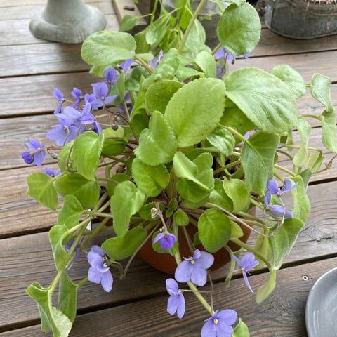 Grön klätterväxt i kruka. Växten har blanka, ovala blad och odlas i innerkruka placerad i ytterkruka av flätad korg. Passar som prydnadsväxt inomhus eller i skyddat läge utomhus under varmare perioder. Kräver regelbunden vattning och trivs i ljust läge utan direkt stark sol under längre perioder.