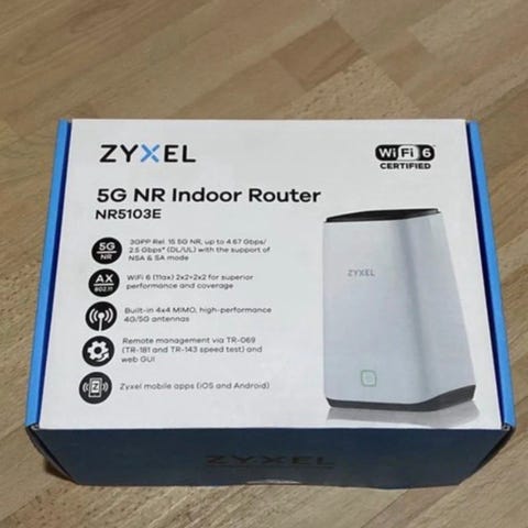 Zyxel NRS103E 5G NR indoor router för SIM-kort i vit färg. Stationär 5G-router för inomhusbruk med stöd för mobilt bredband via 5G NR. På baksidan finns nätverksportar för anslutning av trådbundna enheter samt strömanslutning. Produkten levereras med strömadapter och snabbstartsguide samt originallåda enligt bilderna