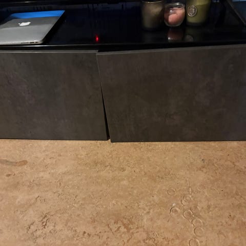 Består av TV-bänk + 2 vitrinskåp med glasdörrar.
