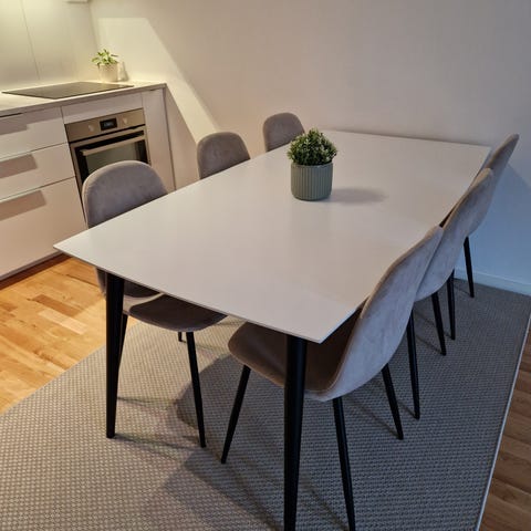 Med måtten 180 x 90 cm rymmer bordet enkelt 6 personer. Den högblanka ytan är inte bara snygg utan också praktisk och mycket lätt att torka av.