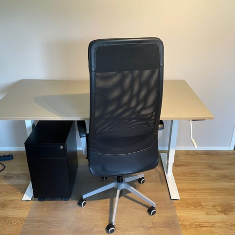Skrivbord med hurts på hjul samt skrivbordsstol, säljes enbart som paket, Hämtas snarast i Täby.