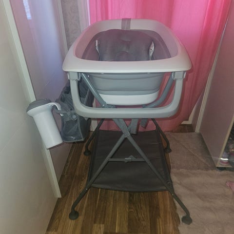Twistshake badbalja med stativ i grått. Badbaljan står på ett hopfällbart stativ med förvaringskorgar undertill för exempelvis blöjor, handdukar eller badleksaker. Insidan av baljan är grå med halkskydd i botten. På en av bilderna syns en grå insats/kudde för extra stöd till bebisen vid bad. Passar för bad av spädbarn och småbarn i hemmet där man vill ha baljan i bekväm arbetshöjd.