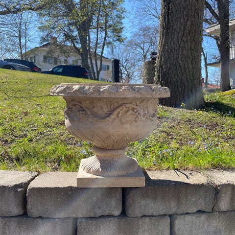 Urnaformade trädgårdskrukor i metall med rostbrun yta. Klassisk form med dekorativ fot och fyrkantig bas. Passar för plantering av blommor eller mindre växter utomhus, exempelvis på altan, uteplats eller i trädgård. Krukorna har dräneringsmöjlighet genom öppning i botten och är avsedda för utomhusbruk där de får en naturlig patina över tid.