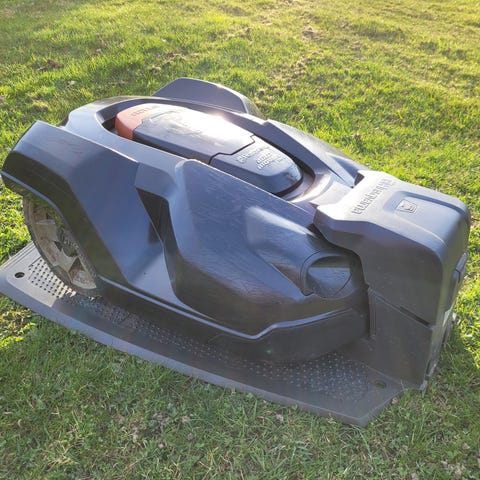 Robotgräsklippare i svart utförande. Modellen är avsedd för automatisk klippning av gräsmatta inom ett avgränsat område. Enheten drivs elektriskt och används tillsammans med laddstation och begränsningskabel (ej synliga på bilden). Passar för trädgårdar där man vill ha regelbunden klippning utan manuell gräsklippning. Kontrollpanel finns på ovansidan för inställning av klipptider och andra grundläggande funktioner.