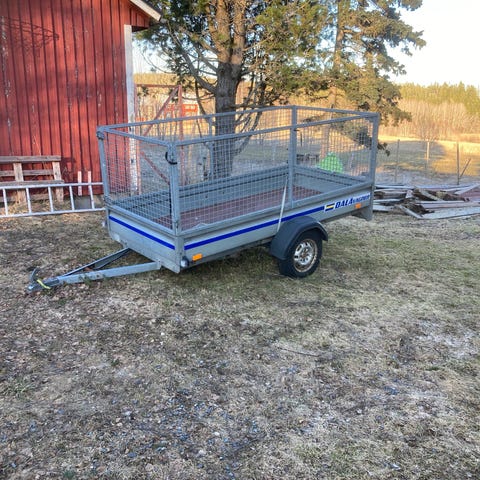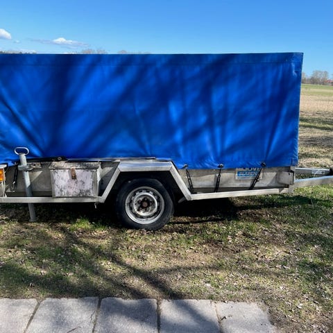 Släpvagn med blått kapell. Vagnen har täckt lastutrymme med träbeklädda innerväggar och plant golv. Lämplig för transport av exempelvis byggmaterial, flyttgods eller annan last som behöver skyddas mot väder. Sommar och vinterdäck. Vinterdäck behöver dock bytas. Besiktigad tom 2027-03-31. Ny belysning runtom.