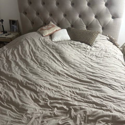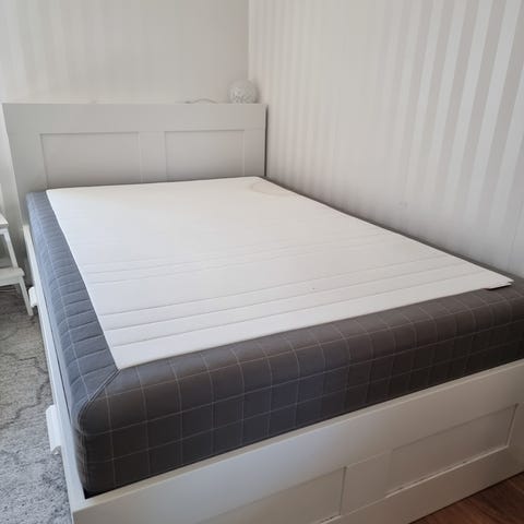 IKEA säng med förvaring i vit färg. Sängen har en hög sängram med flera utdragslådor på sidorna som ger extra förvaringsutrymme under madrassen. Passar som vuxensäng eller dubbelsäng beroende på madrassmått. Sängramen är i träbaserat material med släta och rammönstrade paneler på gavlarna. Neutral design som fungerar i de flesta sovrumsmiljöer.