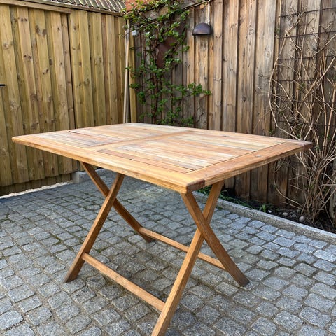 Balkongbord med två matchande stolar i teak. Bordet kan fällas ihop för att ta mindre plats. Stolarna är också hopfällbara. Passar på balkong/uteplats under tak. Färgen är väderbitet då vi uppskattat det går att tvätta och olja/måla om man önskar annat finish.