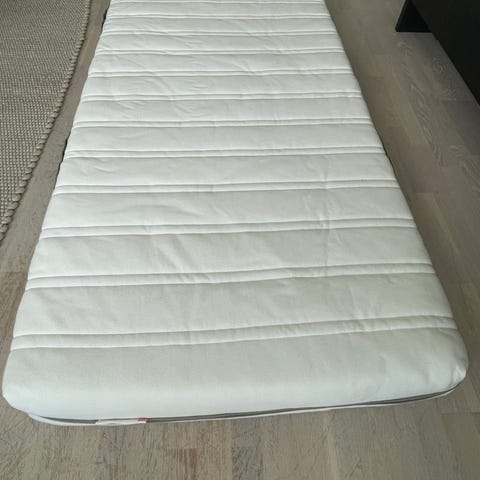 Dreamzone bäddmadrass i vit färg. Madrassen har quiltat överdrag och är rullad för förvaring på bilden. Passar som extra komfortlager ovanpå säng. 90x200 3cm hög. 500kr för båda.