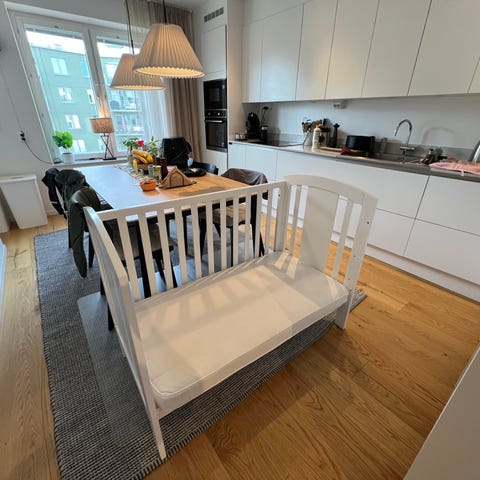 IKEA spjälsäng i vit färg med ribbad sängbotten i trä. Ena långsidan saknas, men sängen kan användas som bedside crib.