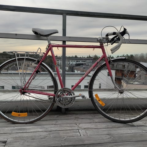 Cykeln är rosa metallic och andas 80-tals kult på bästa vis.