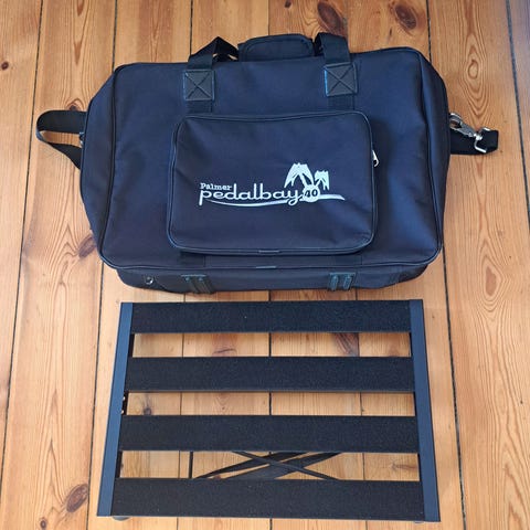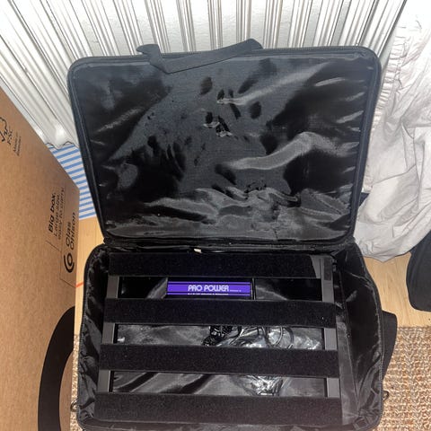 Temple Audio Duo 17 pedalboard för gitarrpedaler i svart metall med tillhörande bärväska. Pedalbordet har perforerad ovansida med hål för flexibel montering av pedaler och kabeldragning. Väskan är vadderad och försedd med handtag och axelrem för transport och förvaring av pedalbordet och tillbehör.