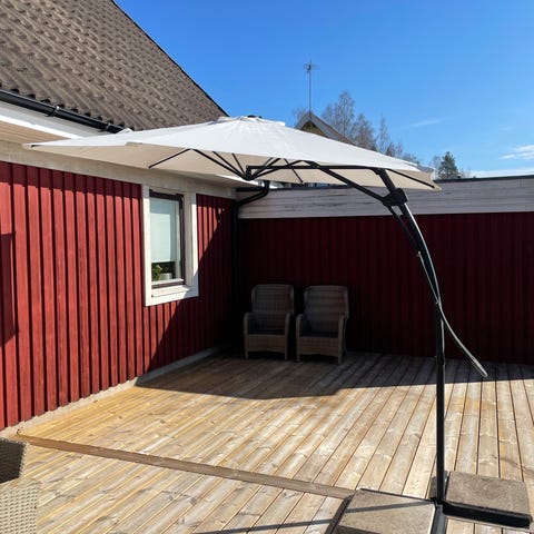 Hillerstorp stor parasoll 300 cm, svart i kraftig aluminium med vev. Sparsamt använd. Komplett med väderskydd. Nypris över 2000 kr