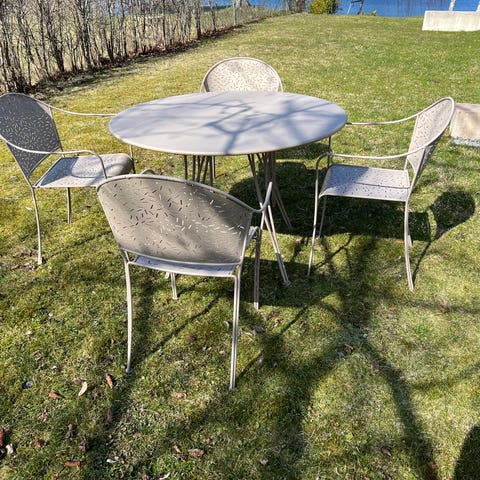 En äldre café grupp i metall stabil m stapelbara stolar Bordet går att fälla ihop vid vinterförvaring