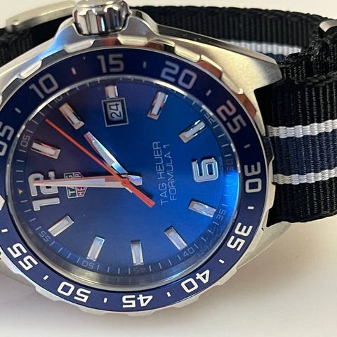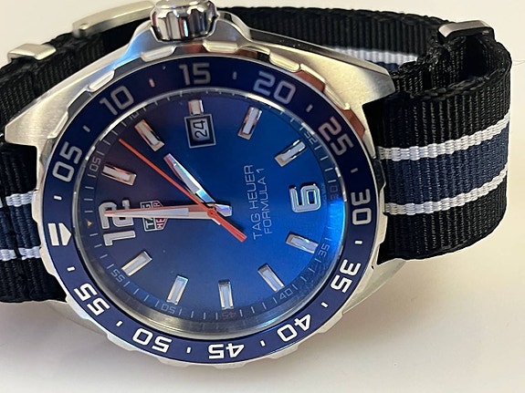 Den blå urtavlan tillsammans med den blå gummiremmen ger klockan ett väldigt snyggt och rent intryck. Modellen är robust, vattentålig och byggd med den kvalitet man förväntar sig av TAG Heuer.