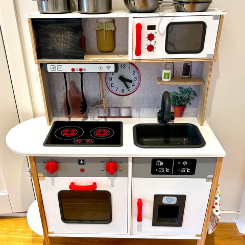 Köket har många roliga funktioner som spis, ugn, mikro, diskho med kran samt kyl/frys. Det finns också kaffemaskin, mixer, kastruller, stekpanna, muggar och andra köksleksaker.