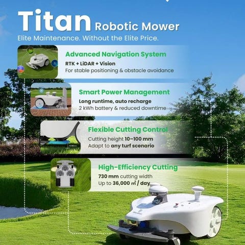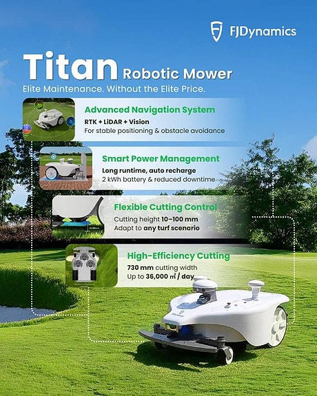 FJD RCM01 är designad för att automatisera gräsklippning på stora ytor. Maskinen kan kartlägga områden snabbt och arbeta dygnet runt med minimal övervakning.