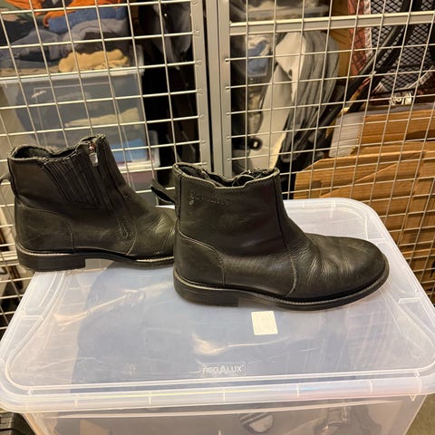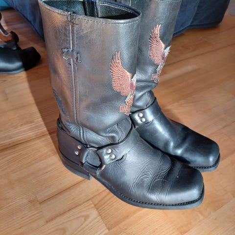 Läderboots, storlek 44, snedställd klack. Använts för motorcykelkörning.