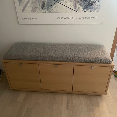 Skoställ Confetti från Rowico i massiv vitpigmenterad ek med sittbänk och skohyllor i ett, i mycket bra skick, använd i bara ett år. Dimensioner:80×30×52cm