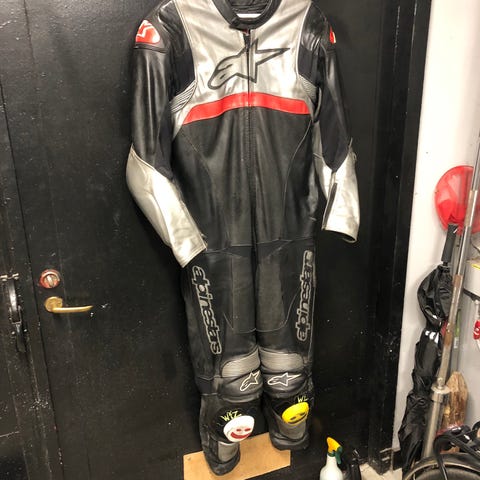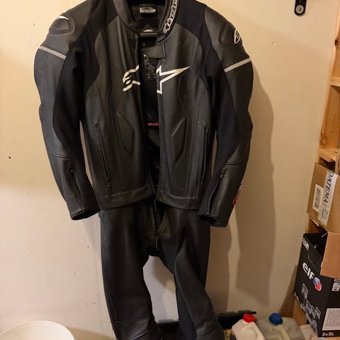 Alpinestars mc-ställ i skinn bestående av jacka och byxor. Färgen är svart med ljusare detaljer på jackans rygg. Byxorna har storlek 52 och jackan har storlek 50 enligt etiketterna. Yttermaterialet är skinn. Pris per del. Byxa 1500:- Jacka 1500:-