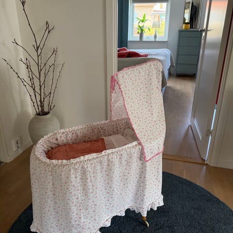 Finns någon rostfläck på metallen (vid skarv) annars mycket fint skick. Alla textilier är nytvättade i oparfymerat tvättmedel.