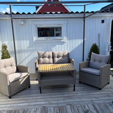 Trädgårdsmöbelset i bambu med ljusgrå dynor. Setet består av en soffa, två fåtöljer och ett lågt bord. Stommen är tillverkad av naturfärgad bambu med synliga bambustänger. Dynorna är tjocka sitt- och ryggdynor i ljusbeige textil. Passar som loungeset för uteplats, altan eller trädgård där man vill ha en sittgrupp med bord för avkoppling och umgänge. Nytt då vi endast haft möblerna för fotografering till hemsida. Nypris 11995, pris nu 8500!