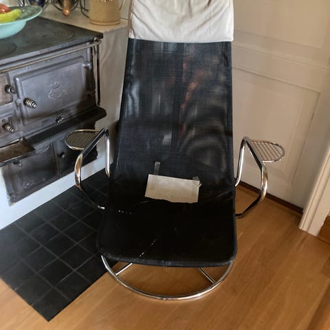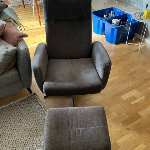 En väldigt fin fåtölj med pall, är nästan som nytt. Säljer då vi inte har användning för den. Finns i Braås