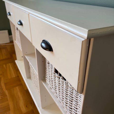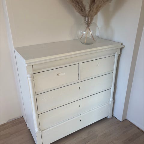 En vit byrå med guldfärgade handtag.