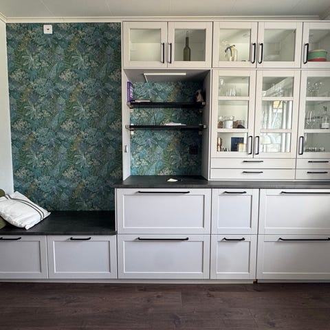 Väggskåp kök med hyllor glasluckor trä