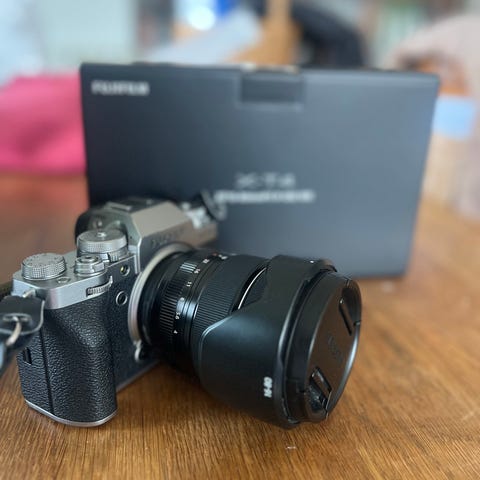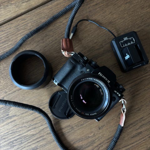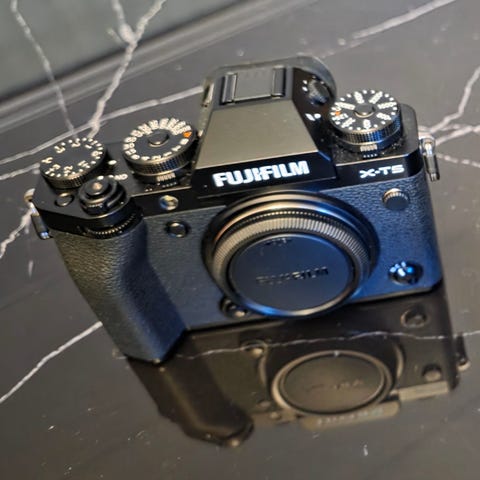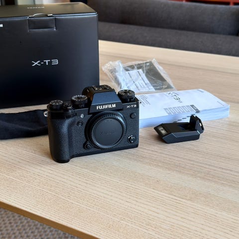 Fujifilm X-T3 digital systemkamera. Kamerahus med elektronisk sökare och vinklingsbar LCD-skärm på baksidan. Kompatibel med Fujifilm X-fattningens objektiv. Passar för stillbildsfoto och videoinspelning. Flera manuella reglage för slutartid, ISO och exponeringskompensation finns på ovansidan av kameran.