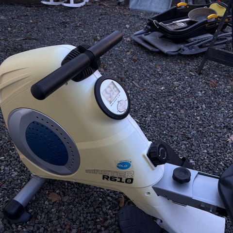 Handhållen träningsmaskin med två handtag i blå färg. Enheten har ett kompakt plastskal och två vadderade handtag för grepp. Avsedd för arm- och överkroppsträning genom roterande eller dragande rörelser. Passar för hemmaträning eller enklare rehabiliteringsövningar där man vill träna styrka och rörlighet i armar och axlar.