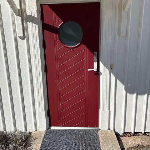 Ytterdörr i röd färg med runt fönster i övre delen. Dörren har slät utsida med dekorativa vertikala spår och är försedd med handtag och lås på båda sidor. Passar som entrédörr till villa eller fritidshus där man önskar insläpp av ljus genom det runda glaspartiet.
