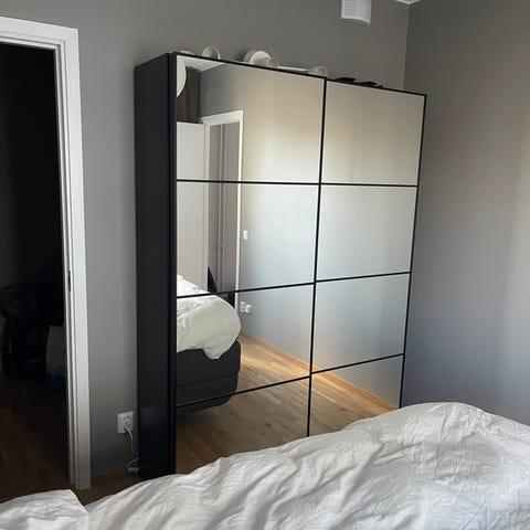 Stor och stilren garderob i mycket fint skick med skjutdörrar i silverfärgad aluminiumram. En dörr är vit och en är spegel, vilket ger ett luftigt och ljust intryck.