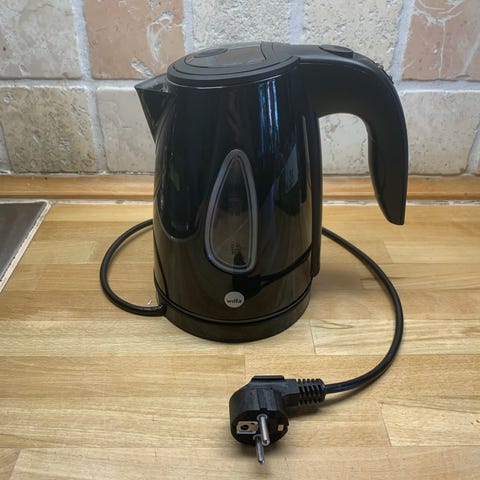 Bosch vattenkokare i svart plast. Modellen har nivåindikator på sidan för enkel avläsning av vattenmängd samt handtag med locköppning och strömbrytare. Vattenkokaren är sladdansluten till basen och är avsedd för uppkokning av vatten i hushållsmiljö, till exempel för te, kaffe eller matlagning.